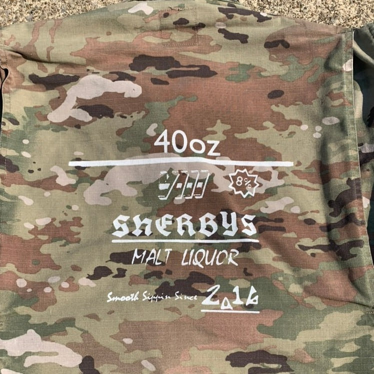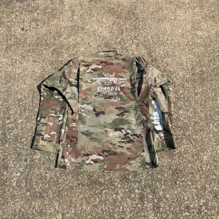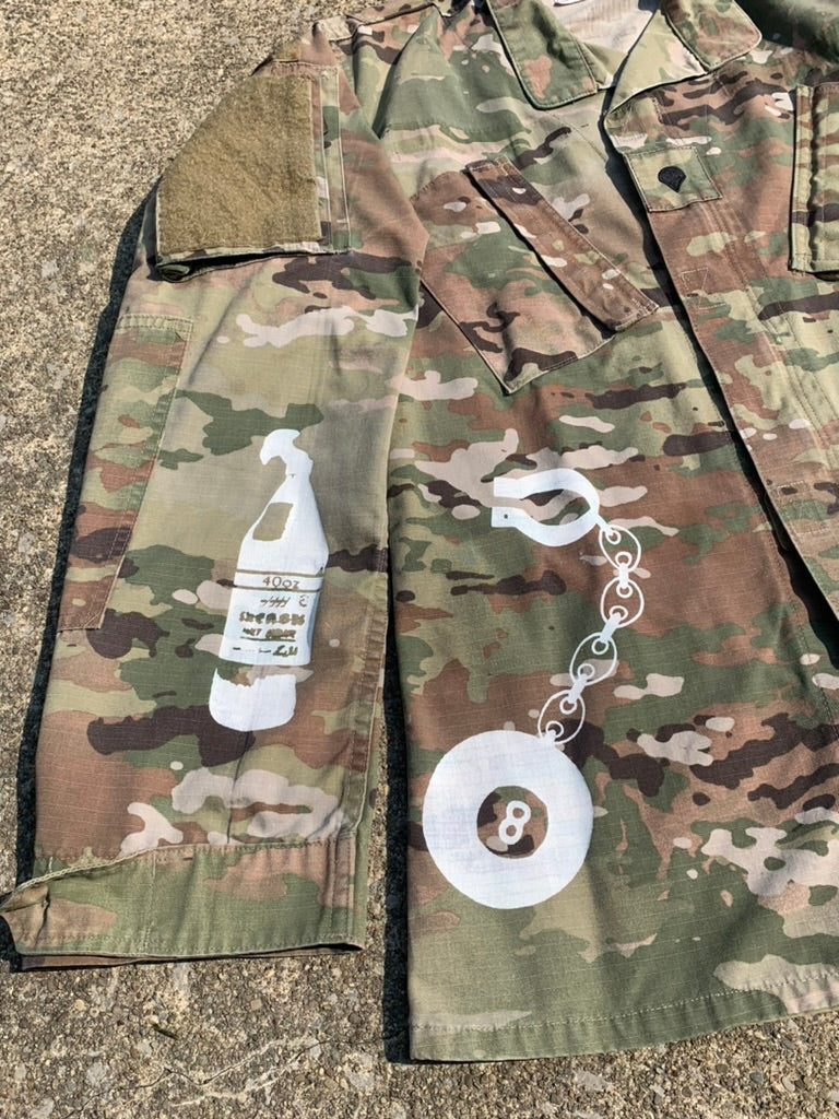 Modern camouflage pattern jacket with hand screened designs on front, back and sleeve
