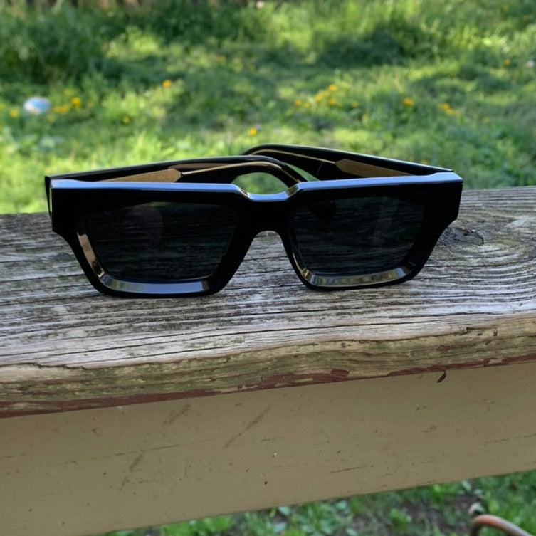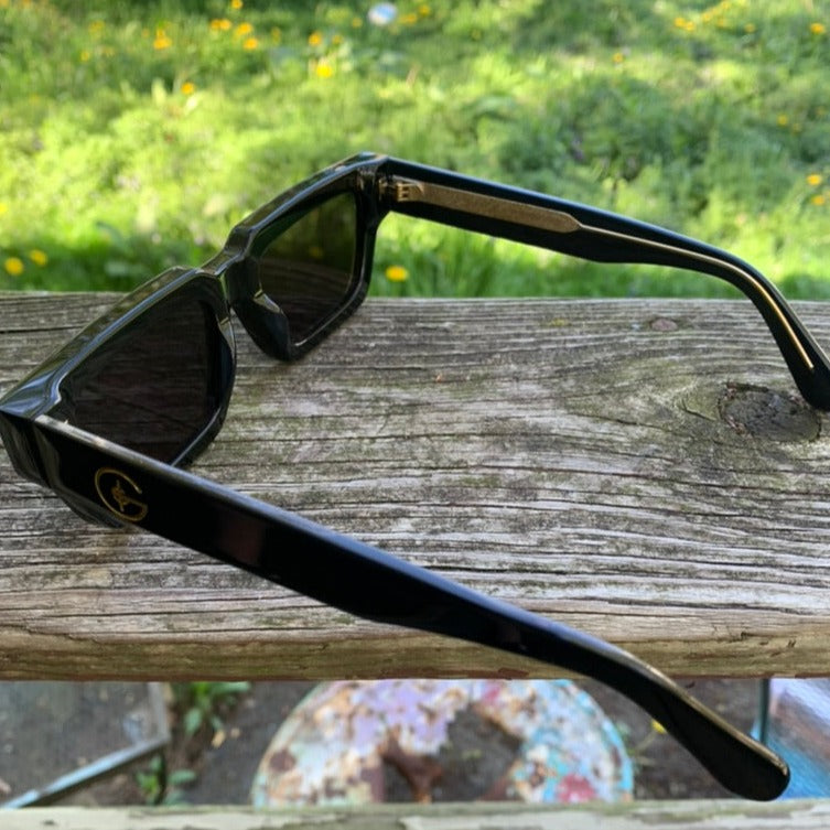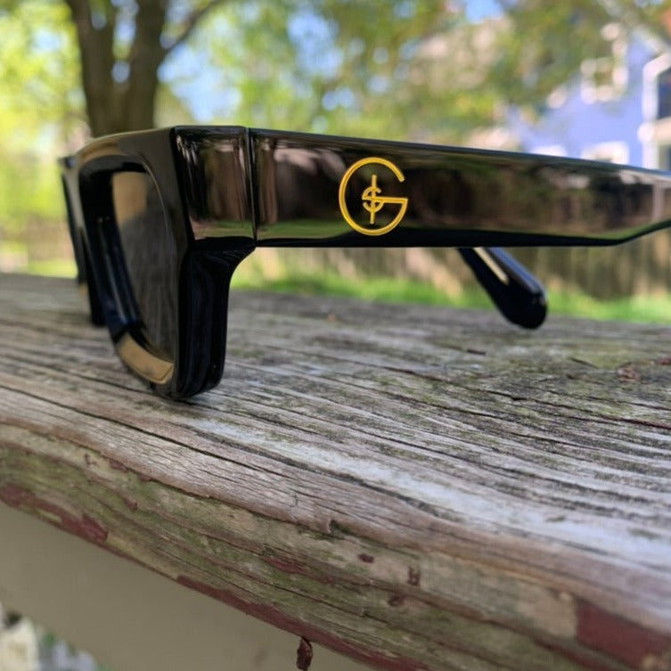 Heavy gauge acetate frames in Wet Pavement with SG 9 logo on side in Gold